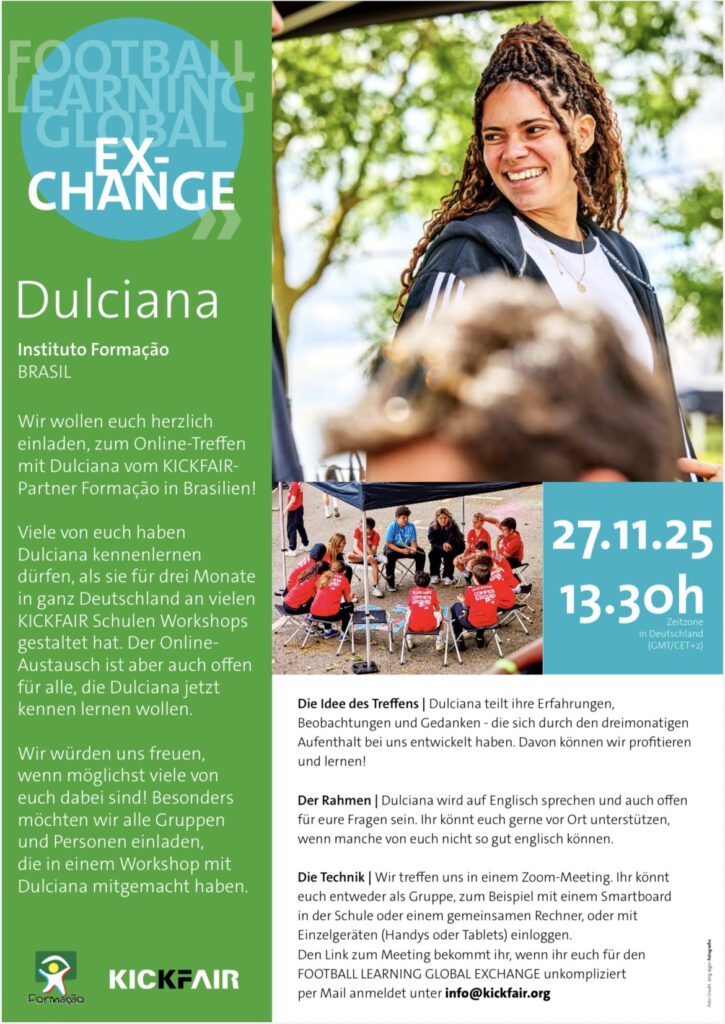 Wir hatten zum ersten Mal eine Videokonferenz mit Kickfair. Während Dulciana in Brasilien war, nahmen wir aus Deutschland teil. An der Konferenz beteiligten sich mehrere Klassen aus verschiedenen Bundesländern. Mit dabei waren auch ehemalige Kickfair-Schülerinnen und -Schüler. Die Begegnung war sehr lustig, spannend und für alle eine besondere Erfahrung. Wir würden so eine Videokonferenz jederzeit wieder machen und freuen uns darauf, uns erneut mit Dulciana auszutauschen.